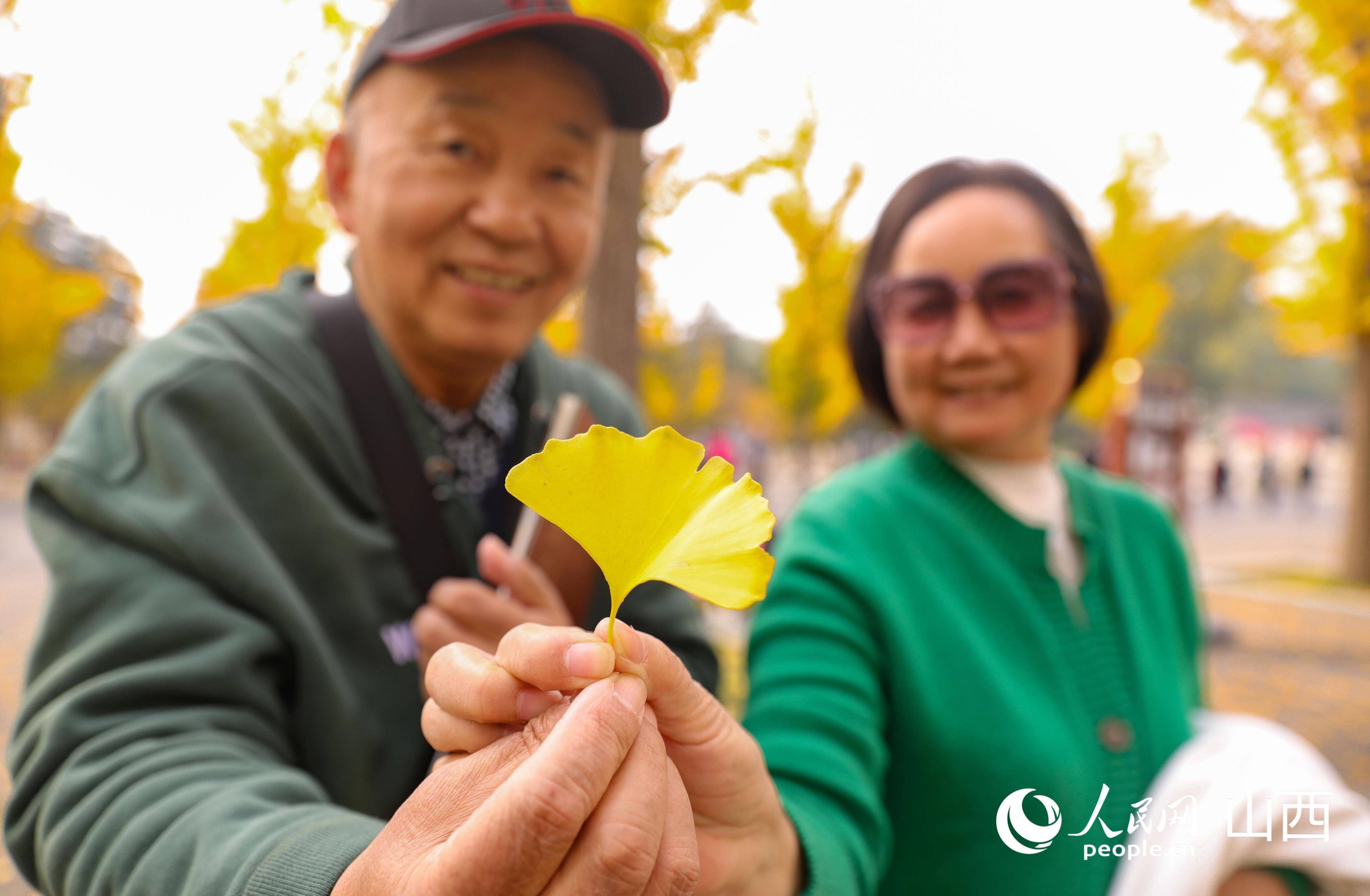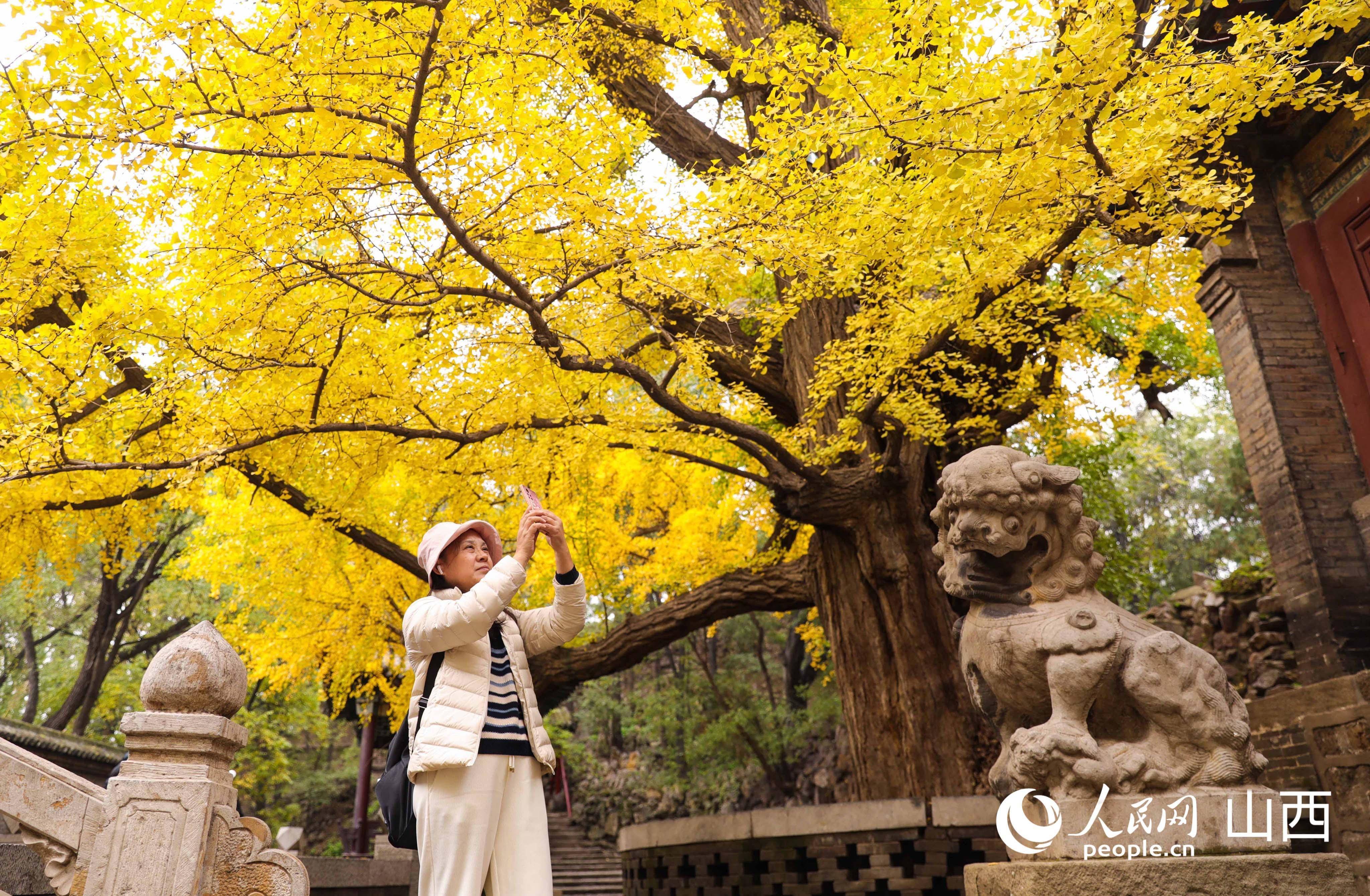 人民网太原10月26日电 (记者王帆)深秋时节,山西省太原市晋祠景区秋意正浓,两株拥有逾五百年树龄的连理银杏褪去翠绿、换上金黄,与红墙灰瓦的古建相映成趣,成为市民游客打卡赏秋的热门去处。