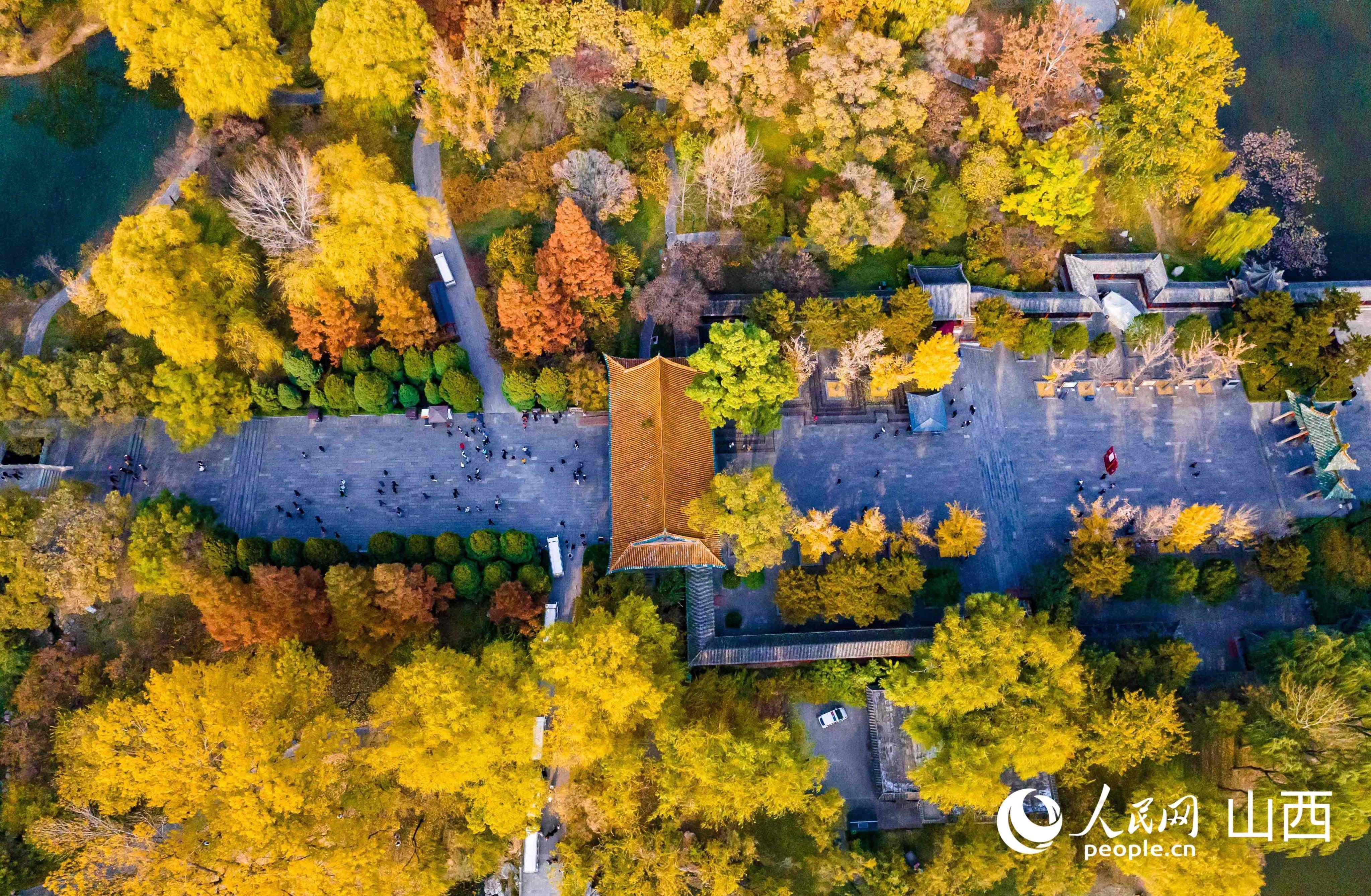 航拍晋祠公园,游人在深秋漫步。人民网记者 王帆摄